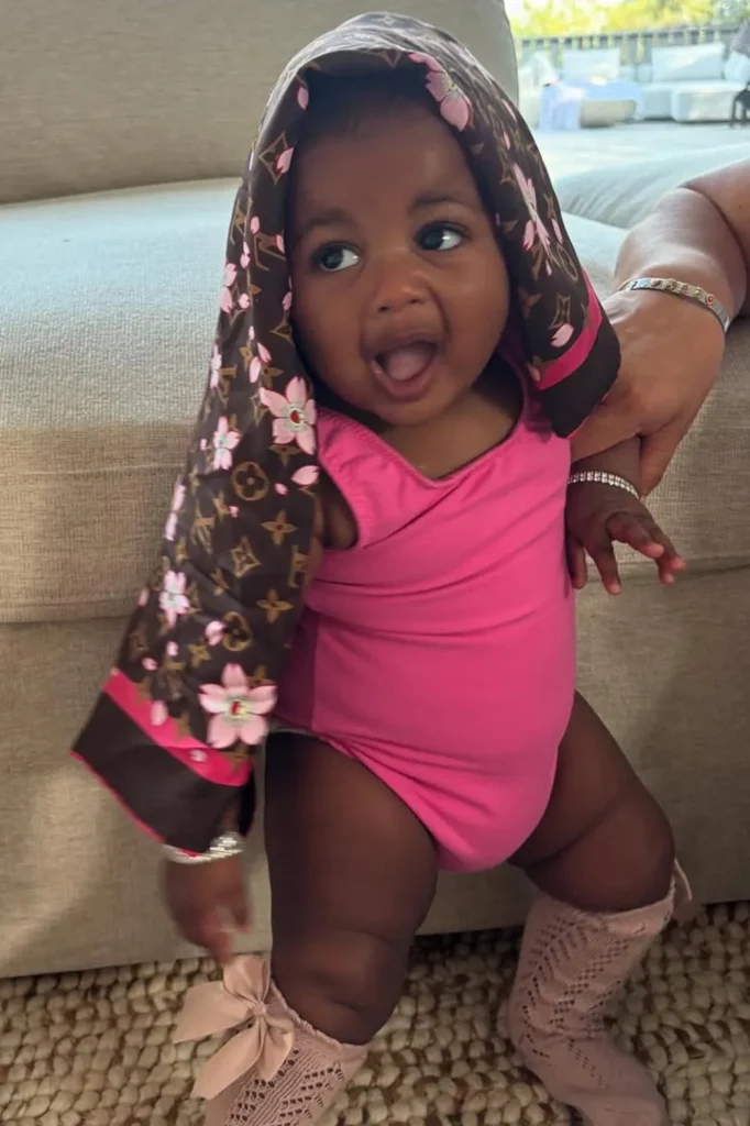 She kicked off the social media post with an adorable picture of Blossom smiling as she sported a hot pink swimsuit with a floral Louis Vuitton scarf sitting atop her head. Other photos of the baby girl included her with her mouth agape, as well as smiling with more accessories from the fashion house.