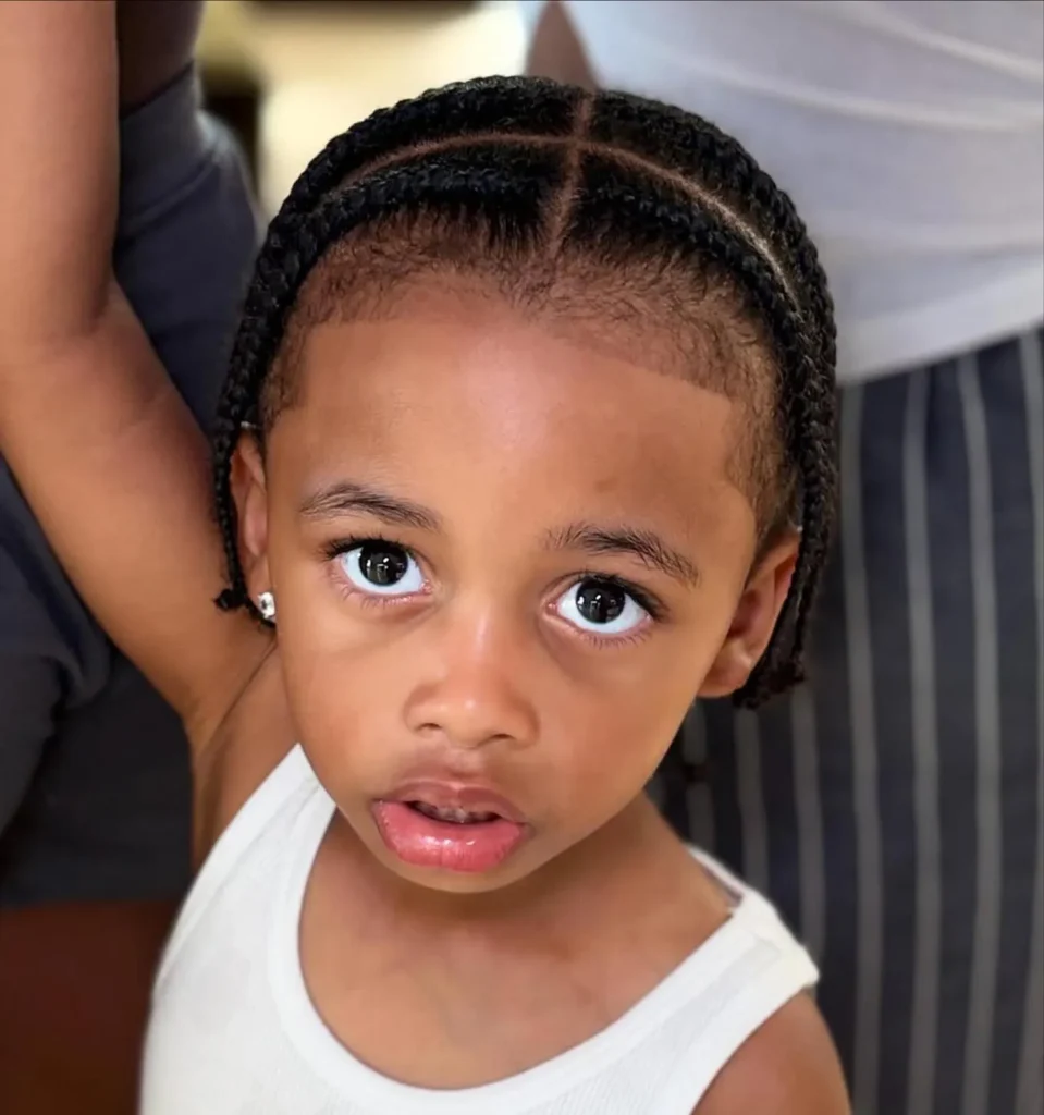 Meanwhile, Wave was photographed looking directly at the camera in one close-up image as he was seen outside. Another photo included the relaxed toddler lounging on a cozy chair in his Timberlands and faded brown shorts.